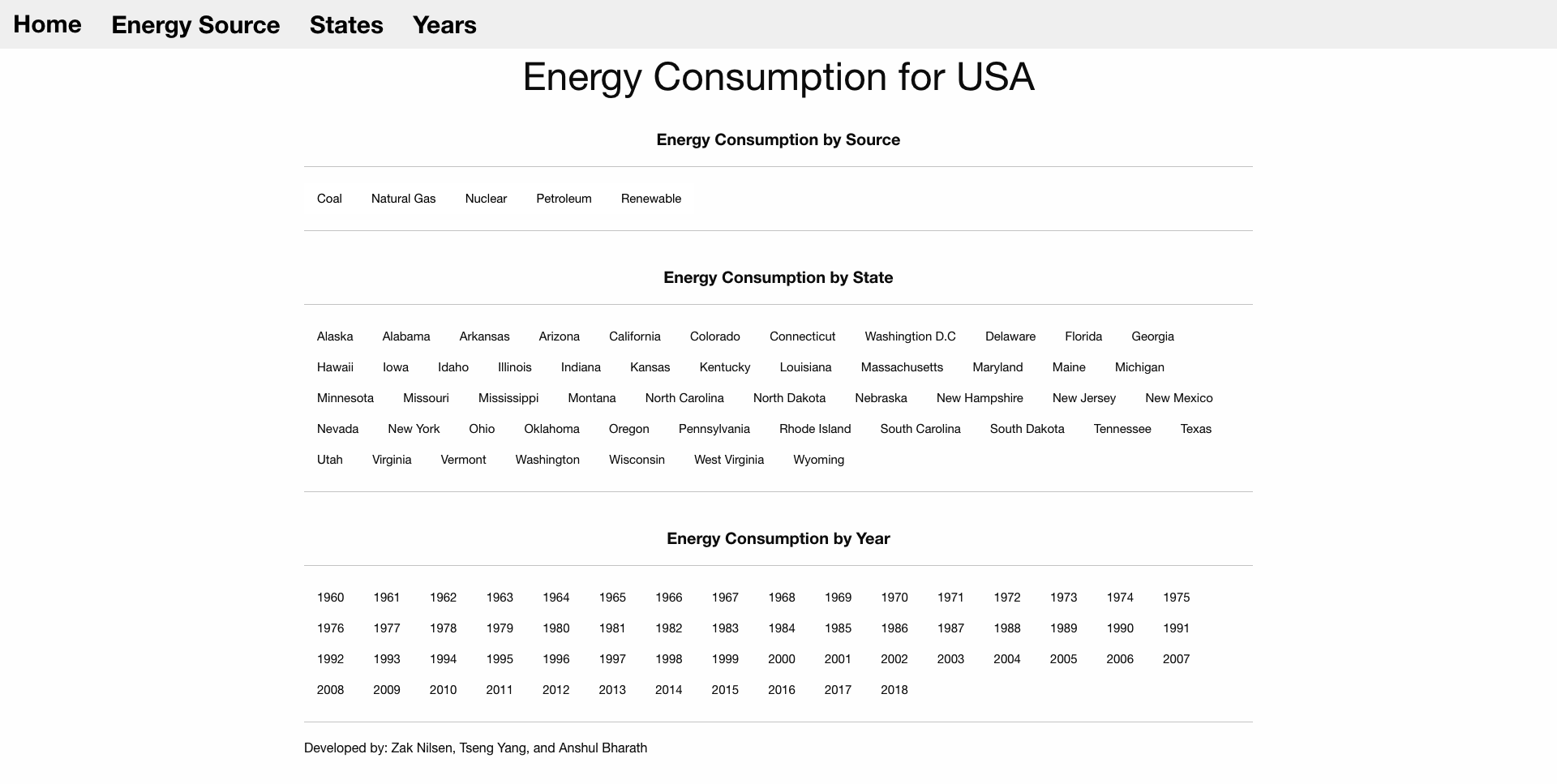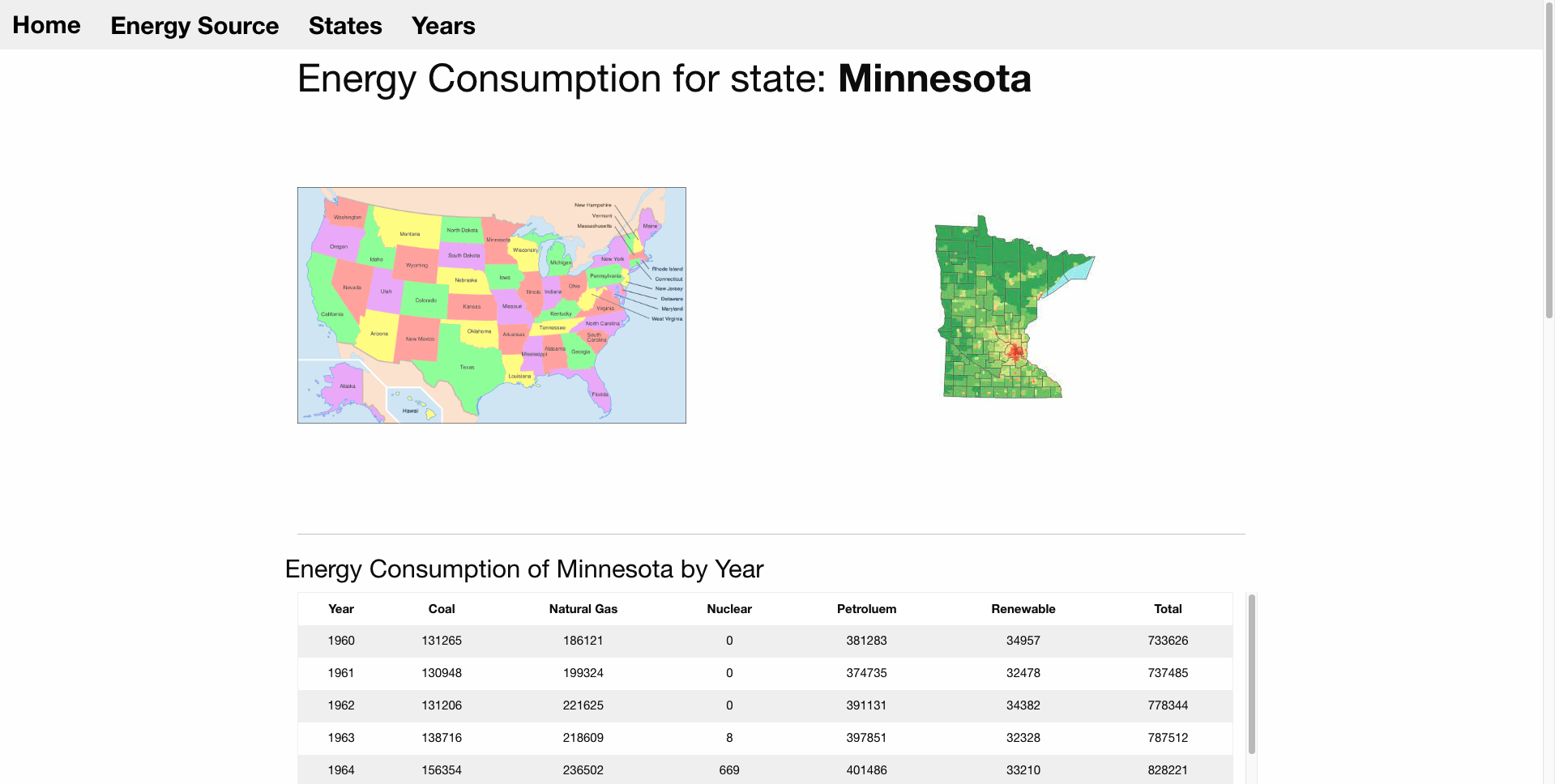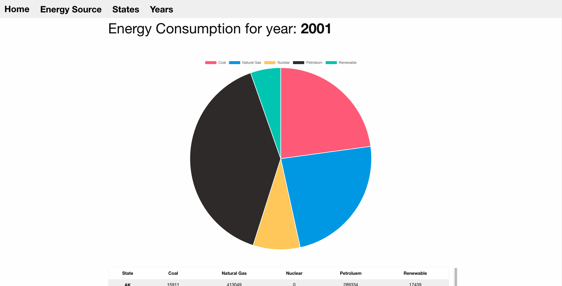This project was an introduction into the vast world of web development. Before this project I had only worked on serverless web sites that rendered static files. After learning the concept of Server Side rendering we were able to put these concepets to use with a full-fledged data representation of US energy consumption. With server-side rendering, we only had to create 3 html pages for our routes, and rendered the content of theses pages from the server. Though server side rendering is not always practical, it does have important functionality and can sometime be much faster.
